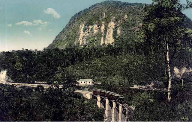 Trem de passageiros da Estrada de Ferro Teresópolis atravessando o viaduto sobre o Rio Paquequer por volta de 1910. Foto: Reprodução da internet